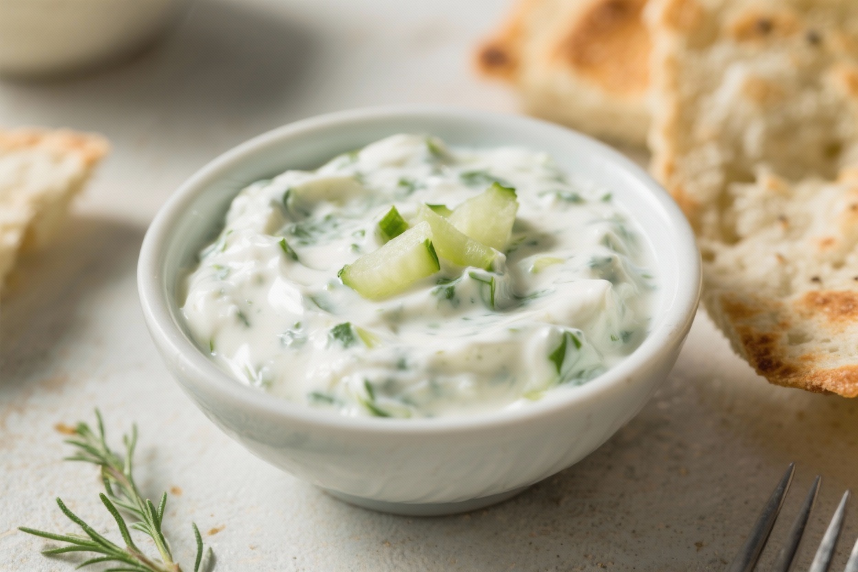 Final dish presentation: Restaurant-quality plating of keto tzatziki in a shallow white bowl with a